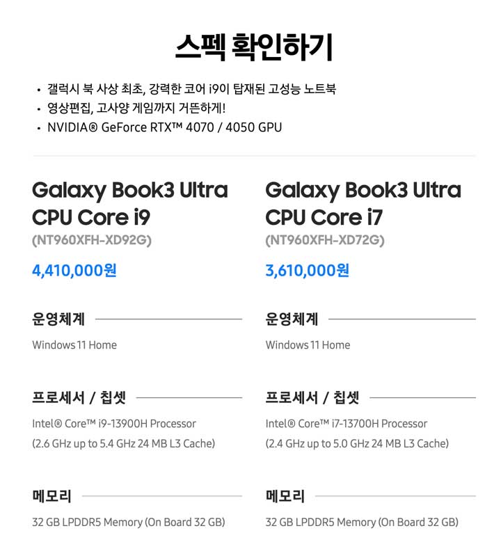 갤럭시북3 울트라는 2가지 기종으로 판매된다. 2가지 기종의 차이는 탑재된 Cpu와 Gpu차이다. 가격은 4,410,00원 3,610,000원으로 80만 원 정도 차이 난다.